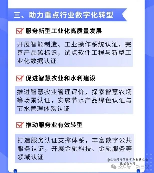 (六)促进智慧农业和水利建设。推进智慧农业管理成熟度认证,促进农业生产智慧转型和农产品加工智能转型。探索开展智慧农场、智慧牧场和智慧渔场数字化场景认证,增强农业生产数字化发展基础能力。推动粮食生产领域认证,支撑种业振兴和粮食安全。实施节水产品绿色认证、节水管理体系认证,推动数字化赋能水利高质量发展。(市场监管总局、水利部、农业农村部、国家数据局按职责分工负责)