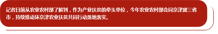 目前,环京津还有不少贫困程度深、集中连片的贫困地区,张家口、承德、保定等市的28个贫困县已经成为脱贫攻坚的硬骨头。农业农村部将推动农业企业、销售主体、科研机构与贫困县深度对接,补上贫困地区产业发展、销售渠道等各方面的短板。