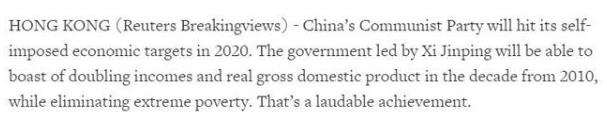 英国路透社此前报道称,中国共产党将在2020年实现自己制定的经济目标:国内生产总值和城乡居民收入比2010年翻一番,同时消除极端贫困。这是一项值得赞扬的成就。