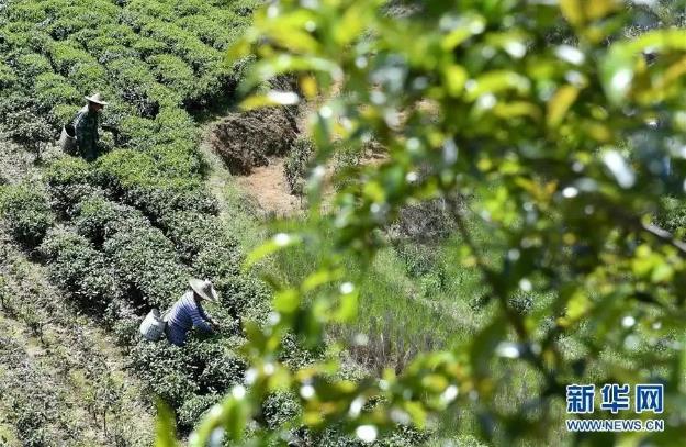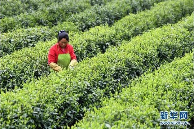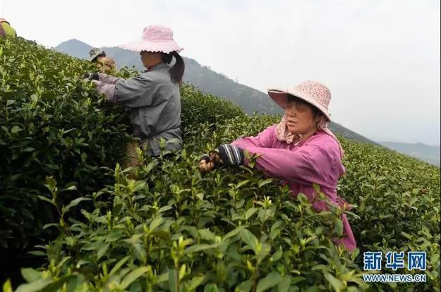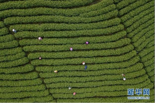 ▲安徽金寨县花石乡大湾村的村民在茶产业扶贫基地里采茶(2020年4月17日摄)。新华社记者 刘军喜 摄