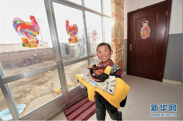 ▲青海互助土族自治县班彦新村的儿童在刚迁入的新居内展示新买的衣服(2017年1月摄)。新华社记者 吴刚 摄