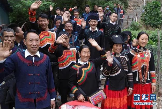 ▲“悬崖村”搬新家的村民在山下公路边合影留念(5月12日摄)。新华社记者 江宏景 摄