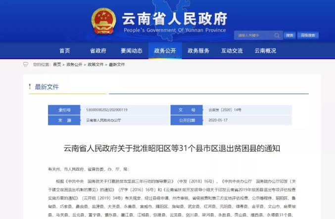 5月17日,云南省人民政府发布通知,正式批准昭阳区等31个县(市、区)退出贫困县序列。