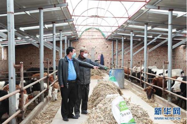 ▲在甘肃省临夏回族自治州广河县庄窠集镇西坪村,全国人大代表马天龙(左)和养牛户马志德讨论养殖问题(3月10日摄)。新华社发(杜哲宇 摄)