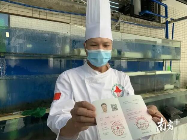 ▲参加粤菜师傅培训,考到职业资格证书后,朱能卿的工资从每月4800元涨到了6000元。南方日报记者 吴明 摄