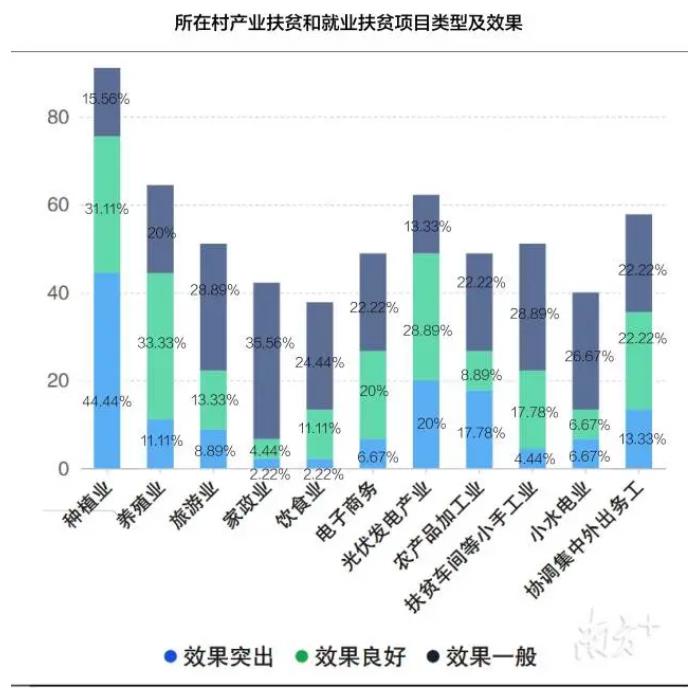 稳定脱贫靠产业,长效脱贫靠就业。广东扶贫,鼓励因地制宜发展地方特色优势扶贫产业。调查结果显示,种植业不论综合效果还是有效率,都是最好的,养殖业次之,集中外出务工第三。说明脱贫并不是脱离乡村,也没有脱离农业实际。同时,宜农则农、宜商则商、宜游则游。加工业、旅游业、电子商务等脱贫项目发挥了重要辅助作用。