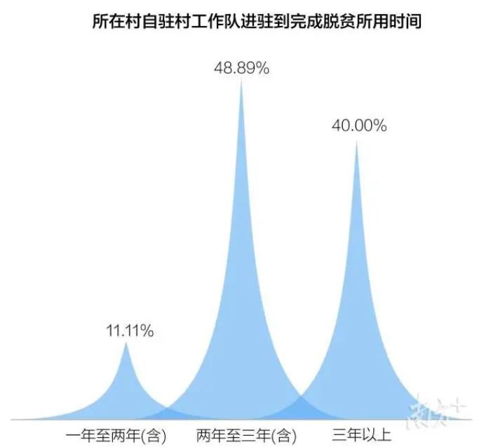 脱贫并非易事,即便驻村扶贫,88.89%的贫困村需要两至三年才能脱贫,40%的贫困村需要三年以上。2016年以来,全省共选派一万多名第一书记,其中向2277个省定贫困村选派4454名第一书记。第一书记自2016年开始驻村,普遍时长在两年至三年,和贫困村完成脱贫时间基本吻合。侧面说明村子一天不脱贫,第一书记和驻村工作队一天不离场。