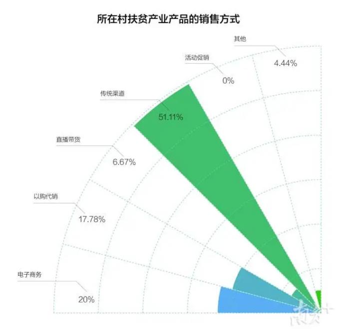 有了产业和产品后,销路就是关键。广东同步开展消费扶贫,认定了517个粤港澳大湾区“菜篮子”生产基地,仅2019年一年,采购销售省内及对口扶贫地区的产品就达984亿元。调查结果显示,超过一半的产品是通过传统渠道外销,农产品受到市场波动的影响仍难以避免,如何拓宽销售渠道应得到重视。电子商务占比20%,已有崛起的势头。直播带货也开始起了作用。