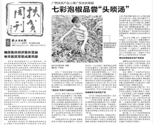 光明日报客户端、南方农村报分别刊登了《广西扶贫产品上架广东扶贫商城,七彩泡椒拔得头筹》、《广西扶贫产品上架广东扶贫商城,七彩泡椒品尝“头啖汤”》,对于“广东扶贫商城以创新形式上线农产品,加力扶贫产品变现”的行动大加褒扬。指出广东扶贫商城与线下展销中心的结合是保障扶贫产业立得住、不烂尾,扶贫产品销得出、卖得好,实现变现增值的关键一招,以创新扶贫载体形式带动扶贫产品向更广阔的市场进军,将一家家农产品推向全国,让一个个贫困农户自力致富。![]()