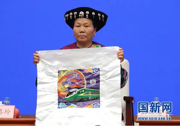 绣的是高铁。我们苗绣搭上中国高铁,走出了大山,沿着“一带一路”走向了全世界。