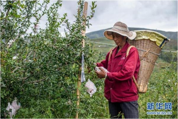 在云南省会泽县娜姑镇干海子村,干海子种植专业合作社的负责人庄锤兵正在地里管护石榴树。