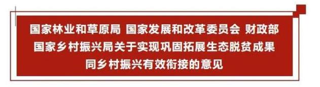 近日,国家林业和草原局、国家发展和改革委员会、财政部、国家乡村振兴局联合印发《关于实现巩固拓展生态脱贫成果同乡村振兴有效衔接的意见》,积极贯彻落实《中共中央国务院关于实现巩固拓展脱贫攻坚成果同乡村振兴有效衔接的意见》,巩固拓展生态脱贫成果,促进乡村振兴。