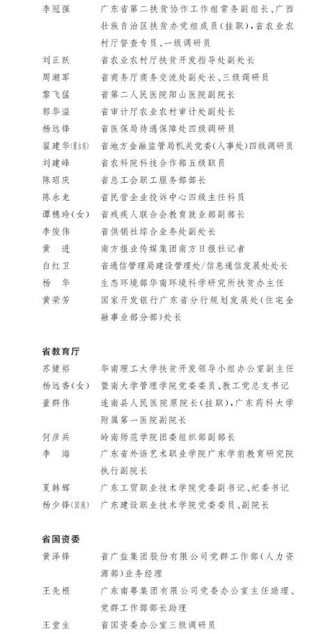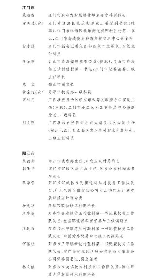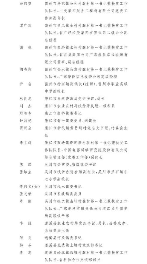 时代造就英雄,伟大来自平凡。在决战脱贫攻坚、决胜全面小康的伟大奋斗历程中,各地区各部门凝心聚力、攻坚克难,各定点帮扶单位鼎力支持、倾情奉献,社会各界协同发力、携手攻坚,广大党员、干部和人民群众吃苦耐劳、自强不息,为夺取脱贫攻坚全面胜利作出了重大贡献,涌现出一大批恪尽职守、开拓进取、敢于担当、甘于奉献、实绩过硬、事迹感人的先进个人和先进集体。为大力弘扬脱贫攻坚精神,充分激发全社会干事创业的责任感、使命感、荣誉感,省委、省政府决定授予肖勇等594名同志“广东省脱贫攻坚先进个人”称号;授予中共广州市委组织部机关委员会等400个集体“广东省脱贫攻坚先进集体”称号。希望受表彰的个人和集体珍惜荣誉、再接再厉,充分发挥模范带头作用,不断为党和人民事业作出新的更大贡献。