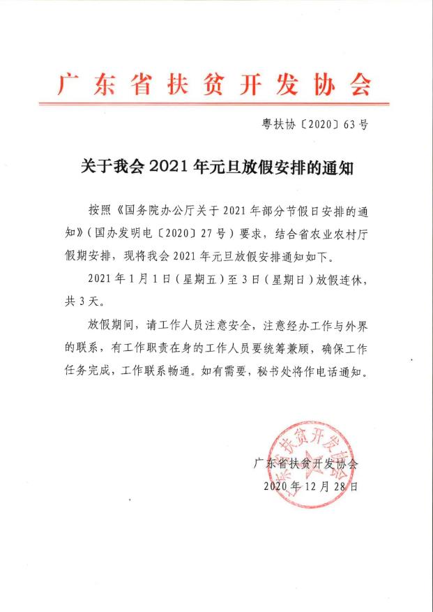 按照《国务院办公厅关于2021年部分节假日安排的通知》(国办发明电〔2020〕27号)要求,结合省农业农村厅假期安排,现将我会2021年元旦放假安排通知如下。
