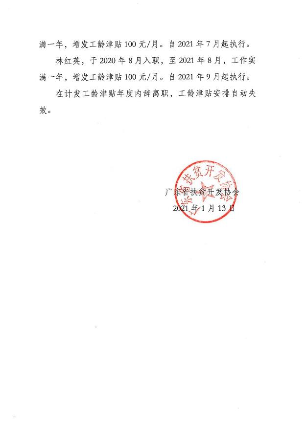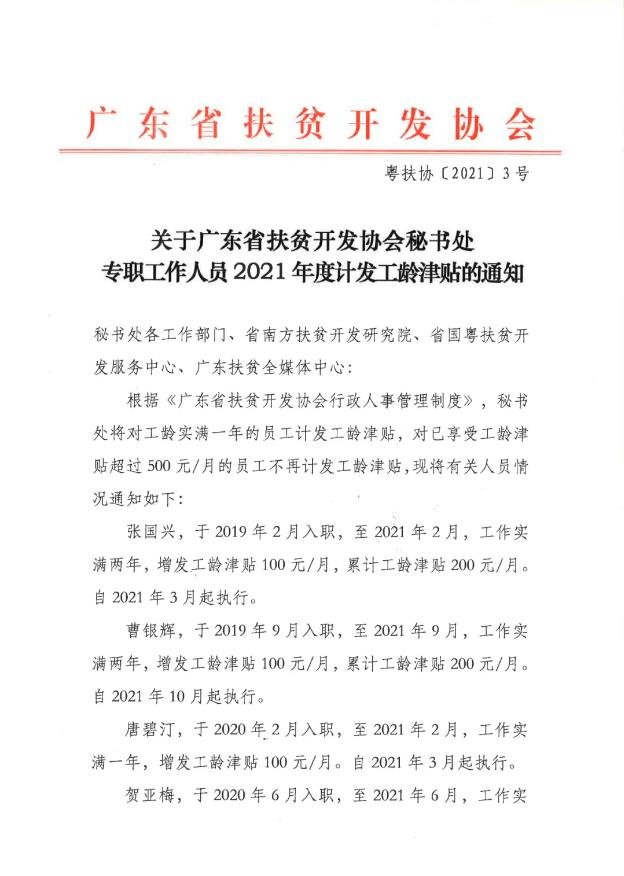 关于广东省扶贫开发协会秘书处专职工作人员2021年度计发工龄津贴的通知