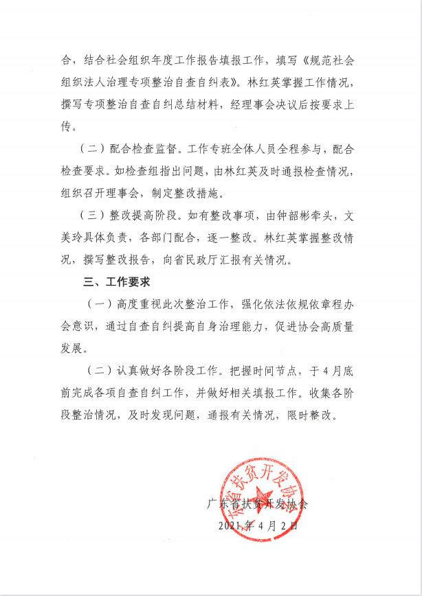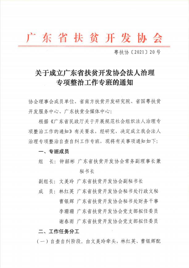 根据《广东省民政厅关于开展规范社会组织法人治理专项整治工作的通知》有关要求,经研究,决定成立我会法人治理专项整治自查自纠工作专班,现将有关事项通知如下: