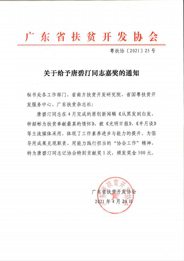 唐碧汀同志在4月完成的原创新闻稿《从黑发到白发,钟韶彬为扶贫奉献最真的情怀》,被《光明日报》、《半月谈》等主流媒体采用,体现了工作素养进步与能力的提升。为倡导用成果兑现职责、用能力践行担当的“协会工作”精神,特为唐碧汀同志记协会特别贡献奖1次,颁发奖金500元。