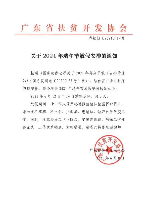 按照《国务院办公厅关于2021年部分节假日安排的通知》(国办发明电〔2020〕27号)要求,结合省农业农村厅假期安排,我会现将2021年端午节放假安排通知如下:
