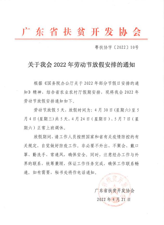 根据《国务院办公厅关于2022年部分节假日安排的通知》精神,结合省农业农村厅假期安排,现将我会2022年劳动节放假安排通知如下。