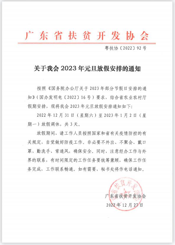 按照《国务院办公厅关于2023年部分节假日安排的通知》(国办发明电〔2022〕16号)要求,结合省农业农村厅假期安排,现将我会2023年元旦放假安排通知如下: