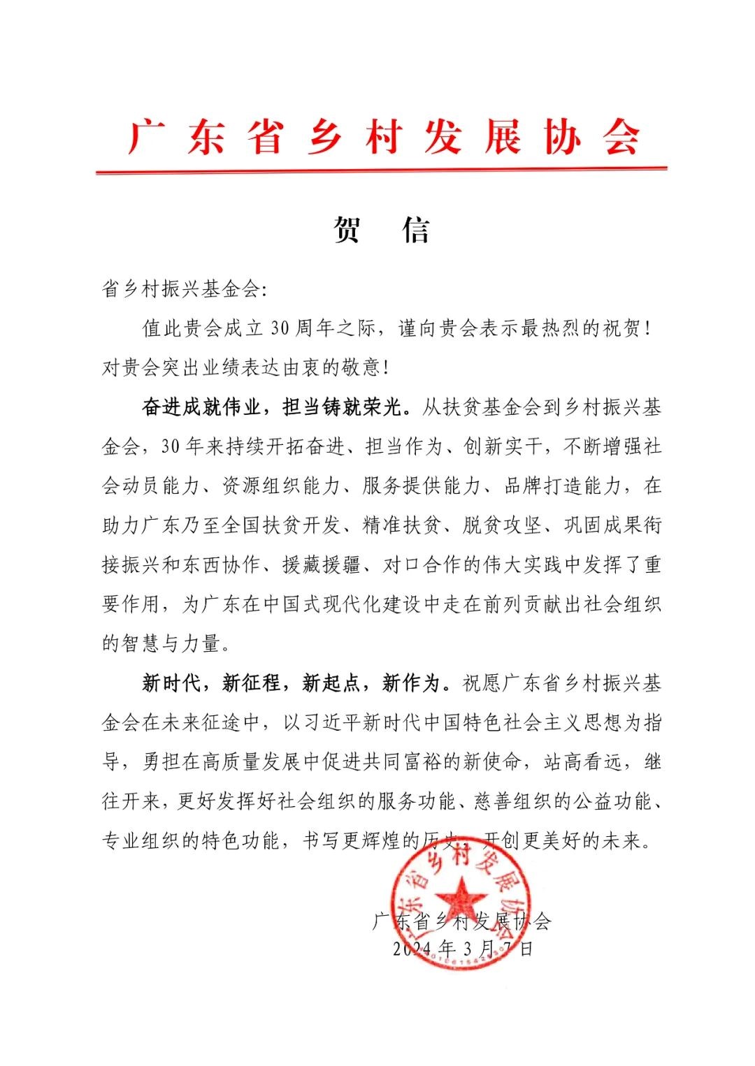 近日,广东省乡村发展协会致信祝贺广东省乡村振兴基金会成立30周年,并对其突出贡献表示由衷的敬意。省政府参事、省乡村发展协会理事长钟韶彬还应邀出席该会成立30周年座谈会。