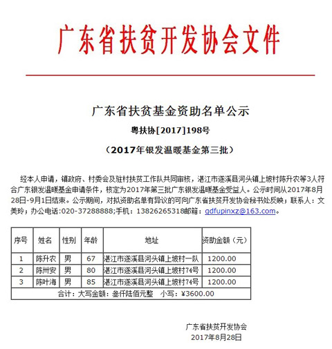 广东省扶贫开发协会2017年第三批银发温暖基金资助名单