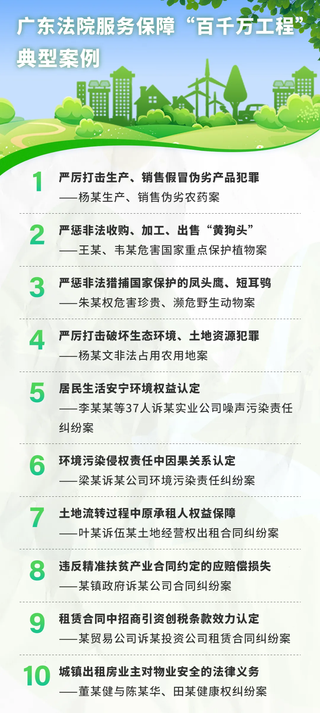 今天,广东省高级人民法院发布10个服务保障“百千万工程”典型案例,主要涉及打击产销假冒伪劣农资、保护基本农田、化解农村土地流转纠纷、引导扶贫产业健康发展、守护生态文明和整治人居环境等内容。
