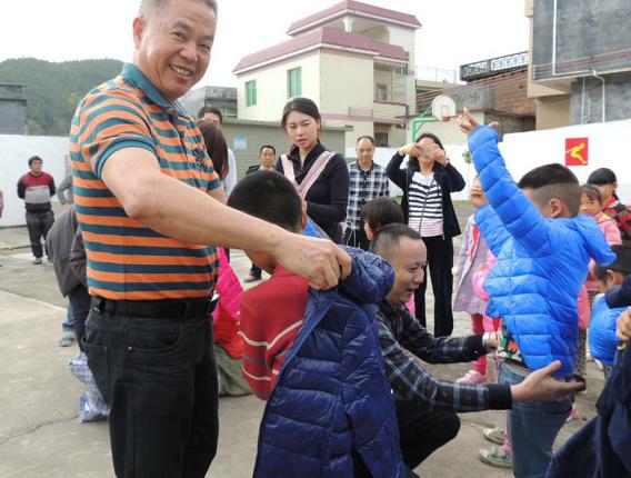 (图:街道王书记为孩子们穿新衣服)
