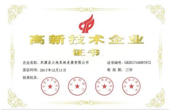 ▲2017年,大地农林被认定为“国家高新技术企业”。