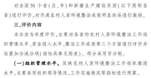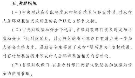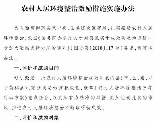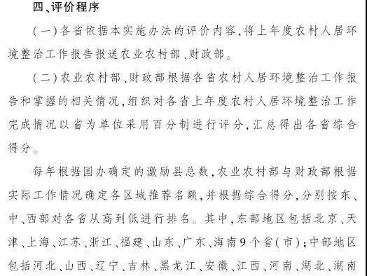 为落实好2019年农村人居环境整治激励措施,请各省(区、市)和新疆生产建设兵团农业农村部门会同财政部门,根据《农村人居环境整治激励措施实施办法》要求,于3月6日前将2018年度农村人居环境整治工作报告(纸质版一式八份和电子版)报农业农村部、财政部(统一邮寄至农业农村部)。2019年,全国拟推荐20个县(市、区、旗,以下简称县),将按照东部地区6个县、中部地区6个县、西部地区8个县确定推荐名额。中央财政在分配年度农村综合改革转移支付时,对农村人居环境整治成效明显的县予以适当倾斜支持。
