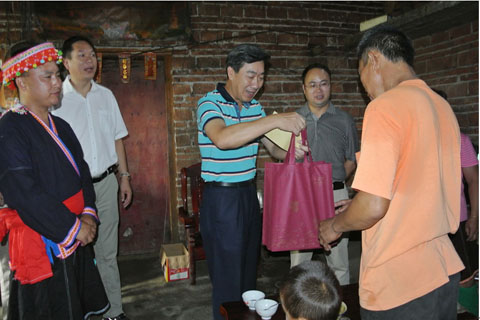 酷暑下,柯惠琪、李惠华、尹国强走家串户,亲切慰问结对帮扶的贫困户,送去慰问金和慰问品,为他们送去省丝绸纺织集团公司党委及干部职工对东芒村贫困群众的亲切关怀和慰问。