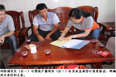 1.在结对帮扶贫困户家中,面对面签订扶贫协议。刘怡副区长结对帮扶的贫困户骆培良,在家务农,家庭收入来源主要依靠种桑养蚕,平时家庭开支较大,目前女儿正在县城就读高中,儿子骆林军今年刚初三毕业,目前计划复读初三或报读中专。由于缺乏资金发展生产,种桑养蚕一直以来只能在保本微利中挣扎,户主计划开发山边荒废的坡地扩大种养规模,并在场内放养家鸡实行立体养殖。了解情况后,刘副区长对骆培良说:“教育投入,是长远的投资。现在虽然是困难点,但将来一定会有美好的未来,希望你能继续关心支持儿女的学习,通过读书让儿女走出山区。顺德有实行‘双零’教育的职中,如果你儿子有意愿报读,我们的驻村队员会积极与顺德的学校联系协商。同时也希望你多学习蚕桑种养的知识,学好技能傍身,提高产量质量,我相信只要你辛勤劳动,在我们的支持帮助下一定会早日脱贫的。”刘副区长还与骆培良签订了扶贫协议书,明确双方的责任和义务,表示区经科局将扶贫“双到”工作列入议事日程,签订协议就是要建立双向互动机制,及时掌握和了解帮扶情况,做到真扶贫、扶真贫。并鼓励骆培良在帮扶单位和帮扶干部的扶持下主动发展、大胆创业,早日脱贫。