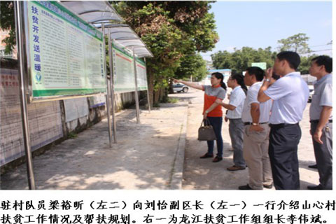 3.检查扶贫工作宣传公示情况。在山心村扶贫公示栏上,帮扶单位、帮扶干部、帮扶规划与措施以及工作组驻村三个月以来的主要工作均作了详细记录,主动接受村民监督。刘副区长对扶贫队员在贫困村安心工作、真情扶贫表示充分肯定,并指导驻村工作组要按照“一村一策、一户一法”的扶贫工作要求,结合帮扶单位的信息、技术、人才优势,充分利用和整合社会资源,制订切实可行的帮扶方案。