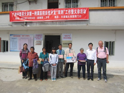 10月24日,在广州中医药大学党委书记黄斌的指导下,广州中医药大学第一附属医院由党委书记冼绍祥和副书记严晋、郭文海带领医疗队一行20多人来到清远市阳山县大崀镇大崀村开展扶贫开发“双到”工作暨义诊活动,受到了阳山县扶贫办副主任邹定君、大崀镇镇长谢峻岭以及大崀村干部群众的热列欢迎。