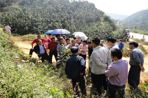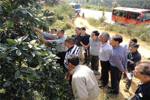 在福建省平和县的福建中润农业开发有限公司,村民们参观了规模为2000多亩的蜜柚种植基地,当地5名蜜柚种植技师现场手把手传授了松土、种植规划、修枝剪枝、施肥、喷农药、套袋、保持土壤生态平衡等方面的专业知识,并进行了互动交流。
