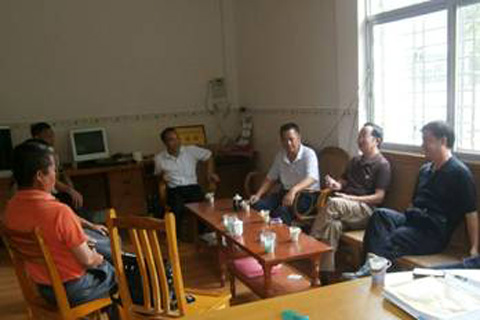 广东机电职业技术学院党委书记李龙图(右2)、副书记郑伟光(右1)与镇、村干部座谈。