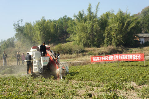 石塘村支书介绍说,花生是当地的传统作物,几乎家家都种,因为采用传统人工种植方式,需要大量人工。目前,石塘村花生种植只有耕整土地实现了机械化,而起垄、播种、中耕培土、收获全是靠人工作业,劳动强度大,生产效率低,在全村大部分劳动力都在外务工的情况下,缺少劳动力大面积种植花生,现在村里许多田地不得已抛荒,在家务农的村民收入难以提高。新一轮扶贫开发“双到”工作开展以后,省法制办帮扶石塘村发展花生种植为主导产业,为此省法制办驻村工作组在赴仁化县考察学习花生全程机械化情况之后,在石塘村进行试验,按机械化采收标准种植花生试验田,并特地租用花生联合收获机为村民进行机械采收现场演示。