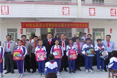 随后,郭晓光一行徒步到大头竹小学参观,见到已完成升级改造的大头竹学校,尤其是学校门口改造、教学楼前活动场所硬底化,感到非常高兴。在大头竹小学球场上,广州恒运集团与大头竹小学举行了助学帮扶活动,学校每一位学生都得到由帮扶单位赠送的书包、文具一套。郭晓光鼓励同学们认真读书,并表示将持续关注学校的发展,努力筹措资源,支持学校改善办学条件,让同学们有一个安全舒适的学校环境读书。在坡塘村,郭晓光董事长得知孤儿两姐妹艰苦读书的事迹后,非常感动,从自己的身上掏钱给孤儿读书生活费,鼓励她们坚强读书,努力成才。