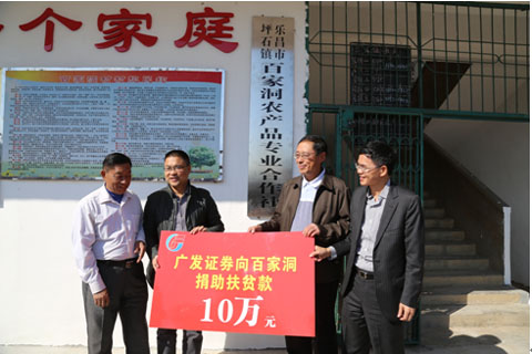 孙树明和欧阳晓冬共同为乐昌市坪石镇百家洞农产品专业合作社揭牌,并代表公司向该村捐助10万元扶贫资金,用于资助贫困户子女读书、为贫困户购买新农合医疗保险和完善村公共设施等,还现场为百家洞每家贫困户发放取暖器,对贫困户进行关心和慰问。