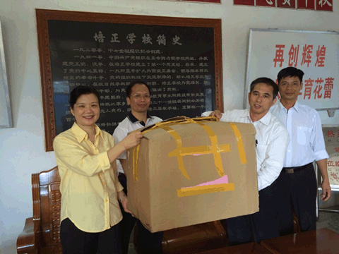 黄紫华书记(左一)为罗洛村培正小学赠送体育用品