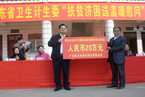 1月2日至3日,省卫生计生委党组书记骆文智、副主任刘银燕一行,在梅州市卫生计生局局长林雨兰、五华县县长范宜军等陪同下,深入到五华县潭下镇光华村开展“春风送温暖”慰问活动。