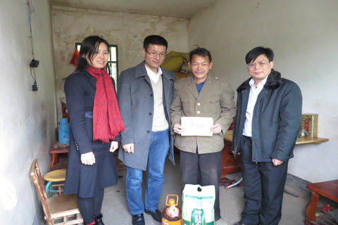 座谈会后,陆磊代表广东金融学院给罗村捐赠了10万元扶贫“双到”资金,并给全村76户贫困户每户发放扶贫启动资金200元。随后,陆磊一行来到有40多年党龄的老村支书卢海涛家中,详细询问了老人身体及生活情况并送上了慰问金和慰问品。在罗村特困户黄桂森的家里,陆磊仔细询问了其家庭情况,鼓励他早日脱贫,并送上了慰问金和慰问品。和平县副县长吴维红、扶贫办副主任罗远智、上陵镇党委书记温海强、罗村村村干部以及我校驻村干部曾晓思等参加了这次活动。