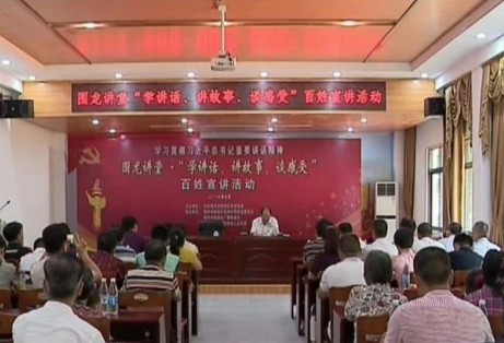 他讲述了精准扶贫的“十子连心专注用心用情,打开水美致富路”的精准脱贫感人故事,讲了许多故事,用“述贫法”来精准识别贫困户,用“多干多得,奖勤罚懒”的奖励办法等制度扶贫来激励贫困户内生脱贫动力,将24字社会主义核心价值观与传统文化结合,用“仁义礼智信善孝”作为自然村的核心要义,还给村民发放家风牌,组织孩子们诵读《弟子规》等,结合村的实际开展党员带富活动及关爱空巢老人活动等,制定村规民约,纯洁文明村风,提升脱贫质量等故事。“今天的活动很接地气,讲的都是很实在的东西,比如关爱空巢老人、资助贫困孩子、邻里和睦相处等很多事例和道理,都很在理。百姓的故事通过百姓讲出来,百姓都听得董、乐意听、也容易接受。”村民曾燕说。