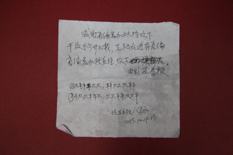 近日,省编办到对口帮扶的梅州市大埔县枫朗镇坎下村调研指导扶贫开发“双到”工作。在与村民代表座谈交流时,村民代表对省编办驻村工作组给予了一致好评,一位年过八旬的村民代表在座谈会上用客家话念了一首名为“感谢省编委办扶持坎下”的打油诗,并将诗写在一个纸片上送给调研组。“开放于今卅几载,先驱后进有差偏。省编委办扶贫挂,坎下村民应着鞭”,这首打油诗是对省编办驻村扶贫工作的肯定,也充分反映了省编办驻村干部与村民良好的干群关系。