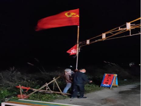 看到为防疫工作设置的村唯一出口被挡住,驻村第一书记邓欢欢、村党总支书记张佐年带领值班人员冒雨抢修,经过半个多小时的努力,最终确保了岗哨的安全。狂风暴雨夜,党旗在联安村的防疫岗哨上空迎风飘扬,为疫情防控工作指引着方向,凝聚着力量。